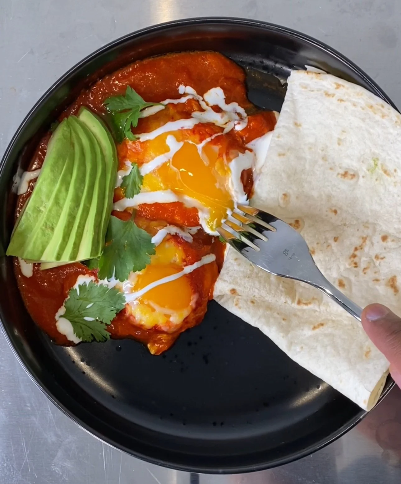 This is the Sunday breakfast I’ve been dreaming of—a perfectly runny yolk, swimming in a mouthwateringly spicy sauce with avocado to cool you down and warm tortilla to soak everything up.